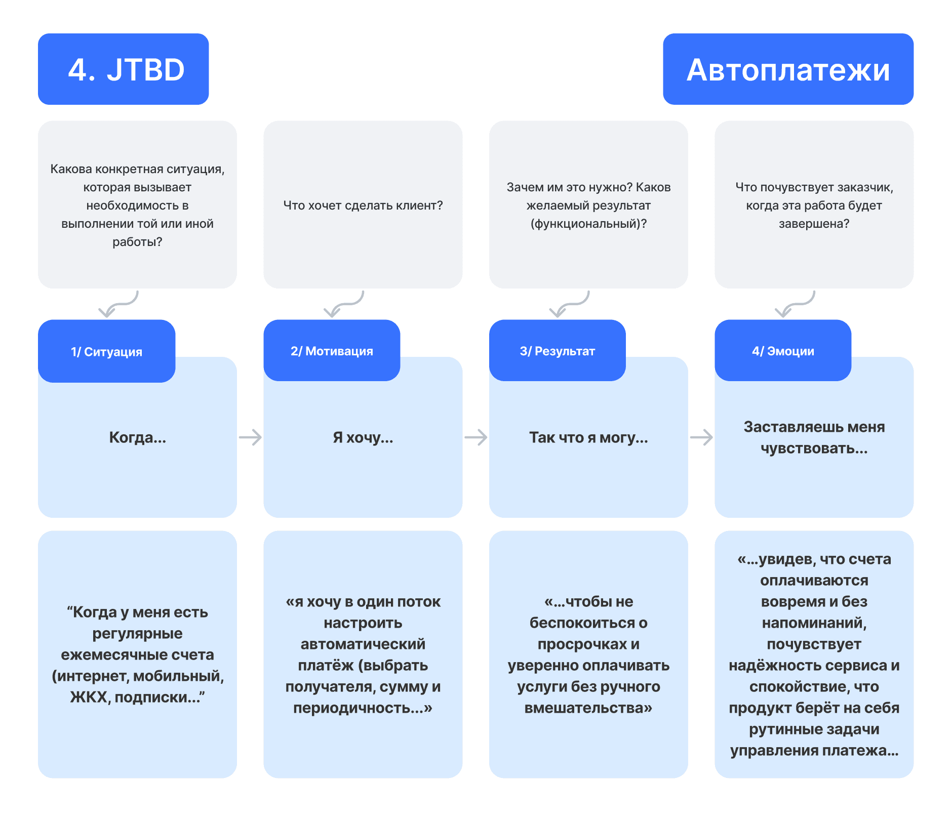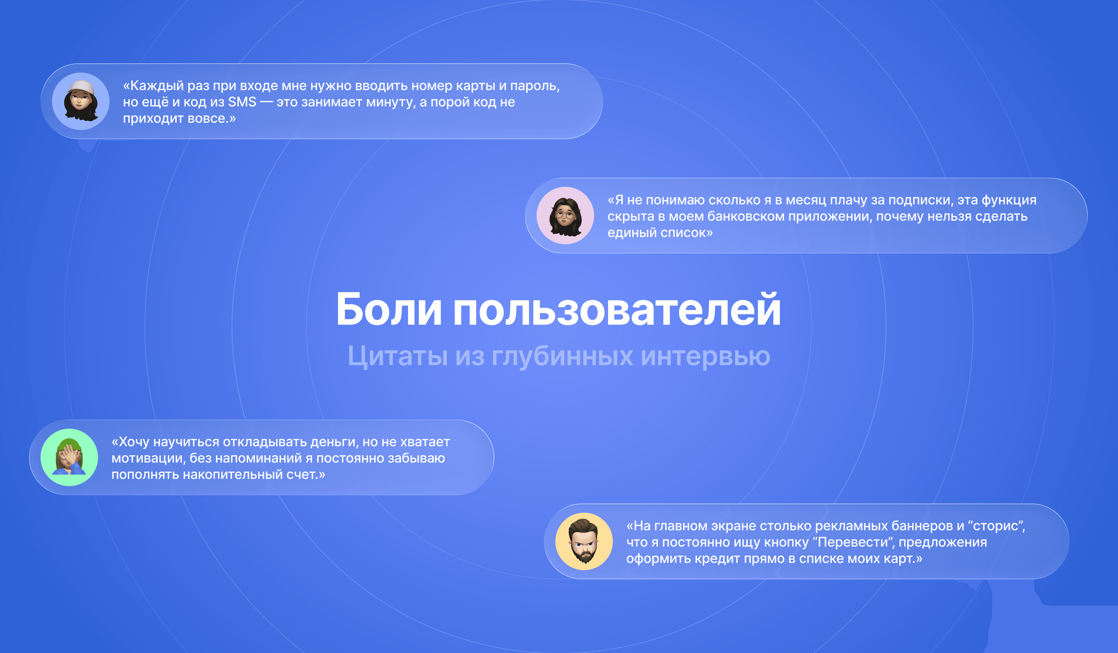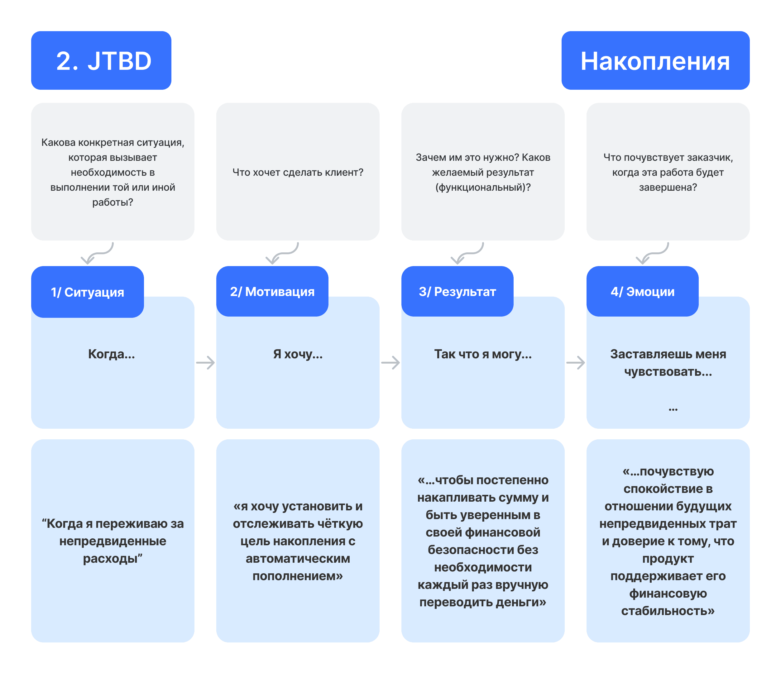 JTBD для четырёх ключевых сценариев (Переводы, Накопления, Аналитика, Автоплатежи) помогли связать реальные потребности пользователей с будущими решениями.