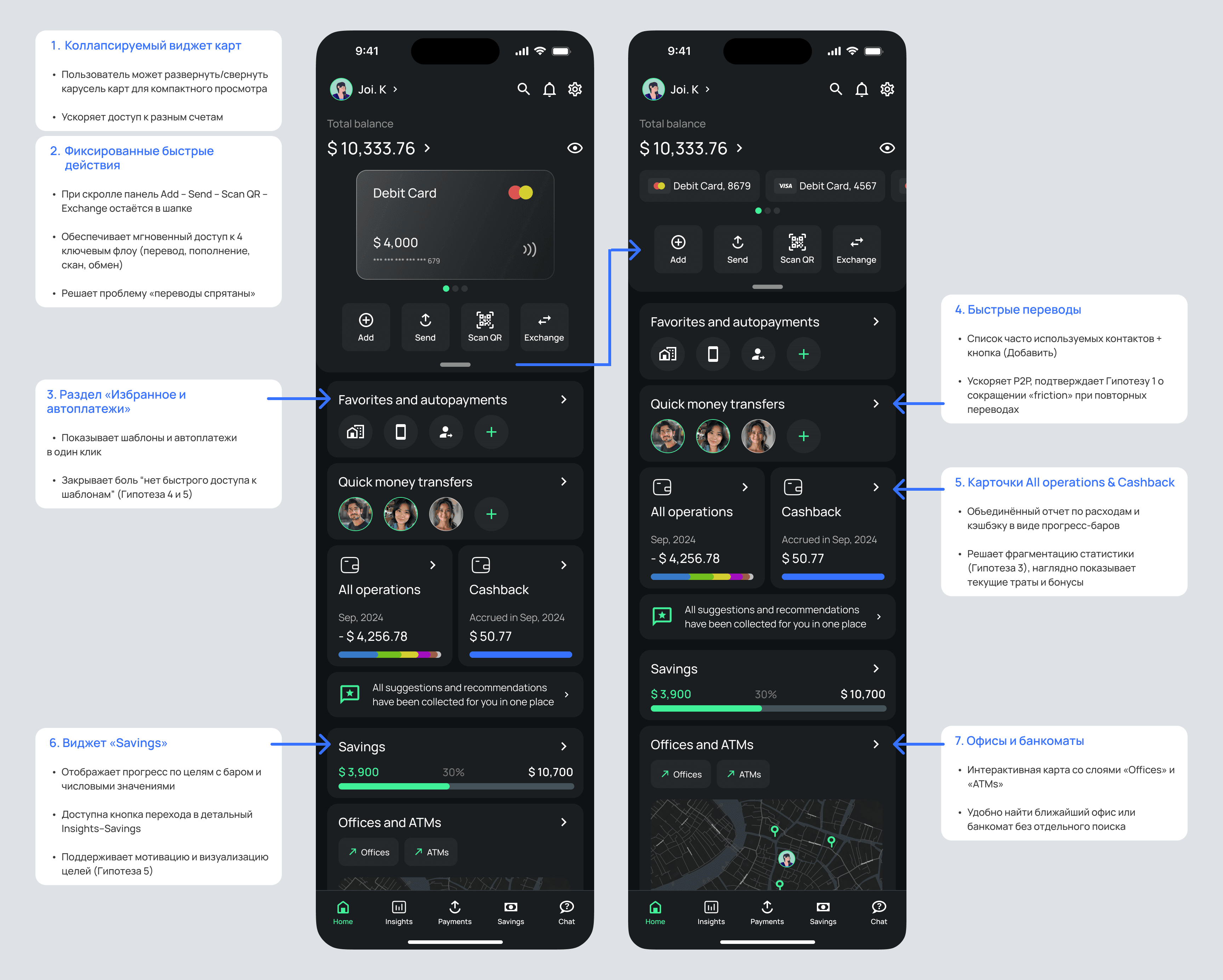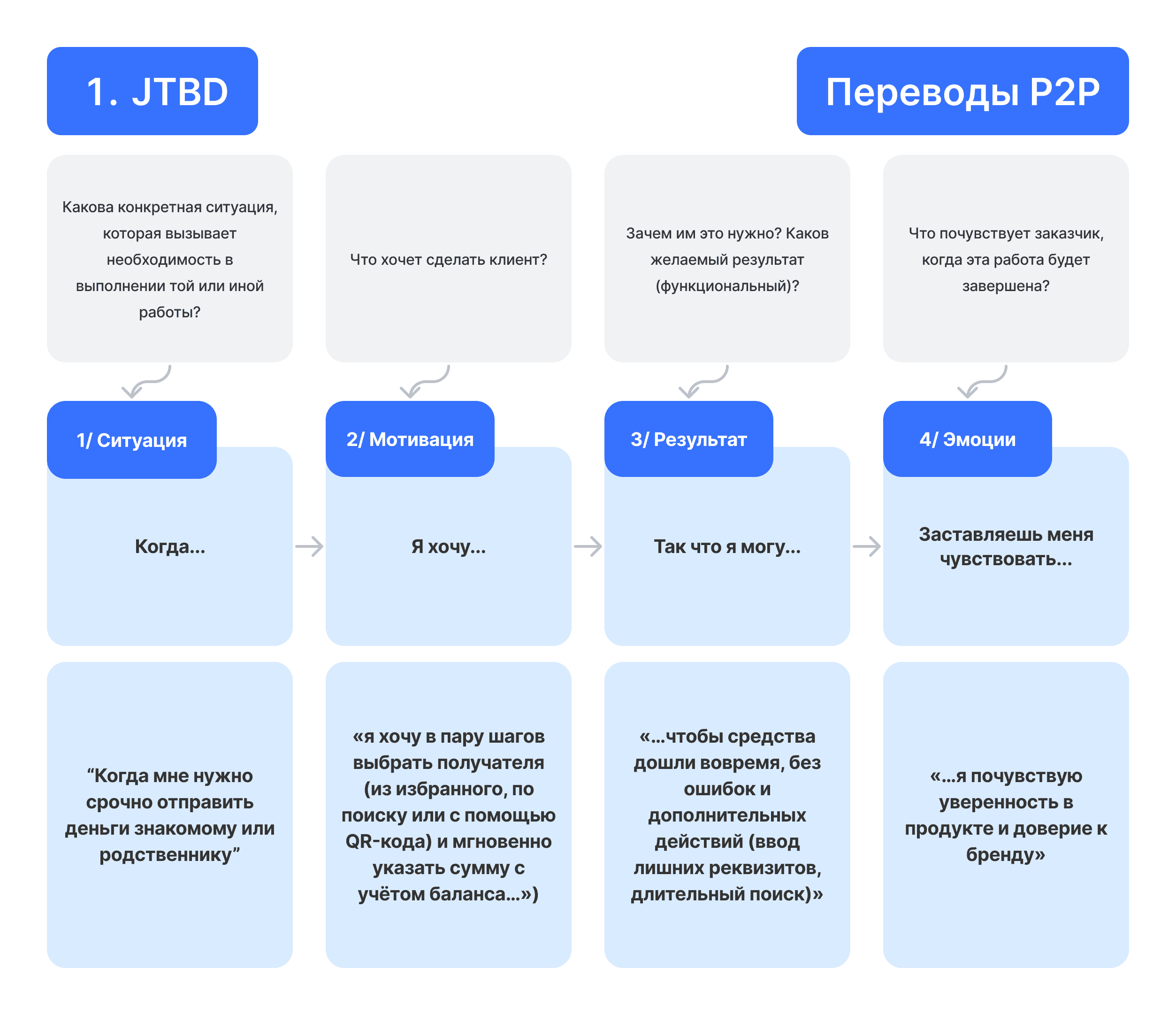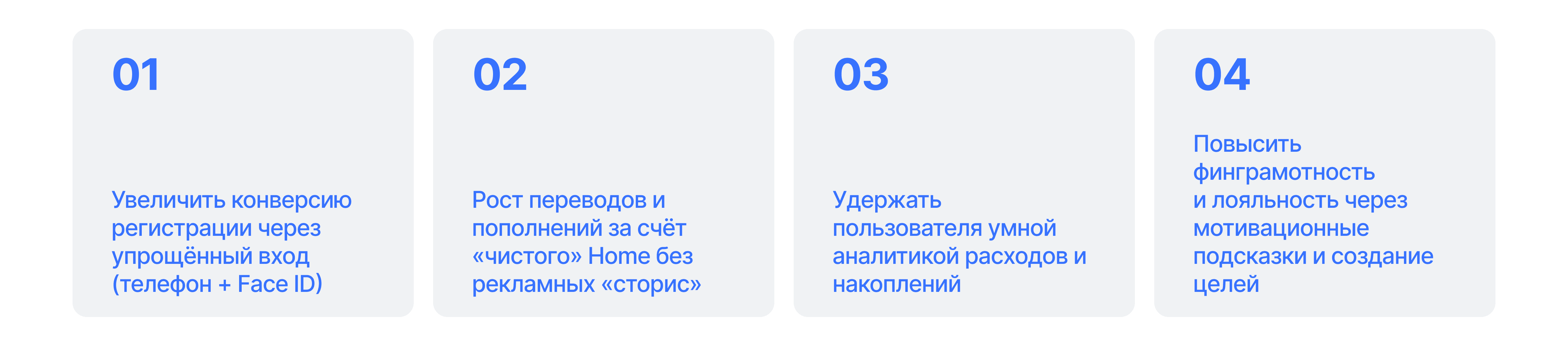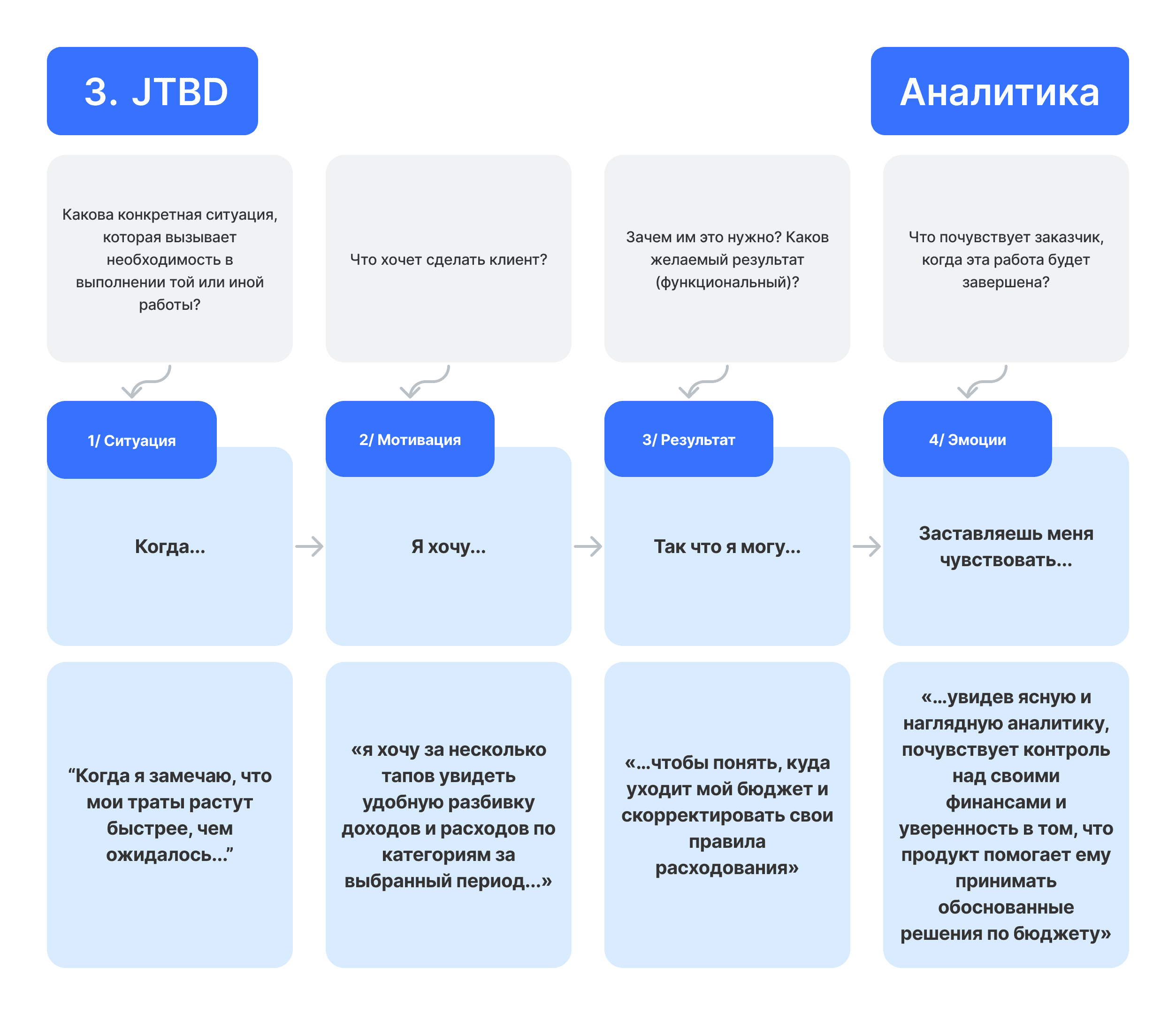 JTBD для четырёх ключевых сценариев (Переводы, Накопления, Аналитика, Автоплатежи) помогли связать реальные потребности пользователей с будущими решениями.