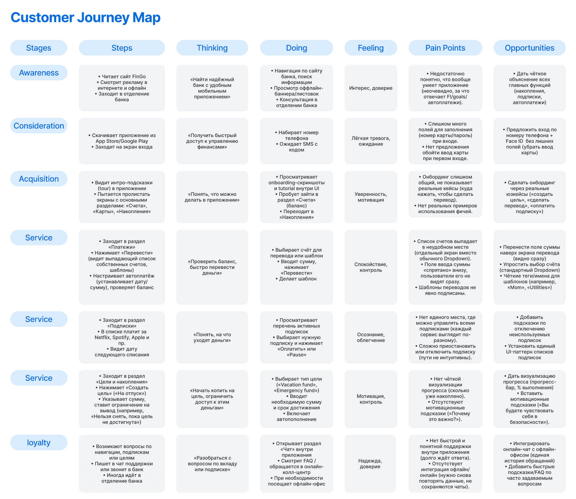 CJM охватывает этапы: Узнавание → Установка → Онбординг → Счета → Подписки → Накопления → Поддержка.