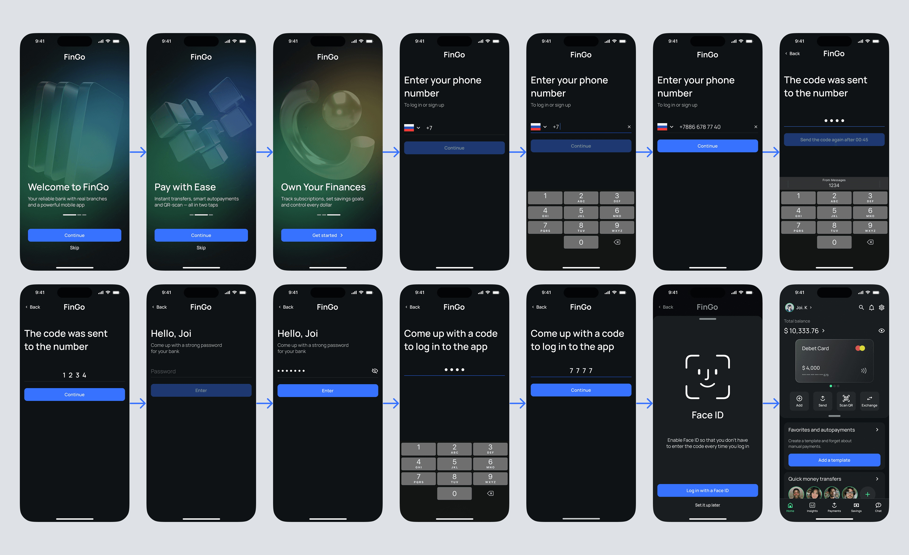 FinGo — мобильное банковское приложение, которое упрощает переводы и автоплатежи, даёт наглядную аналитику расходов и доходов, мотивирует копить и развивает финансовую грамотность.
